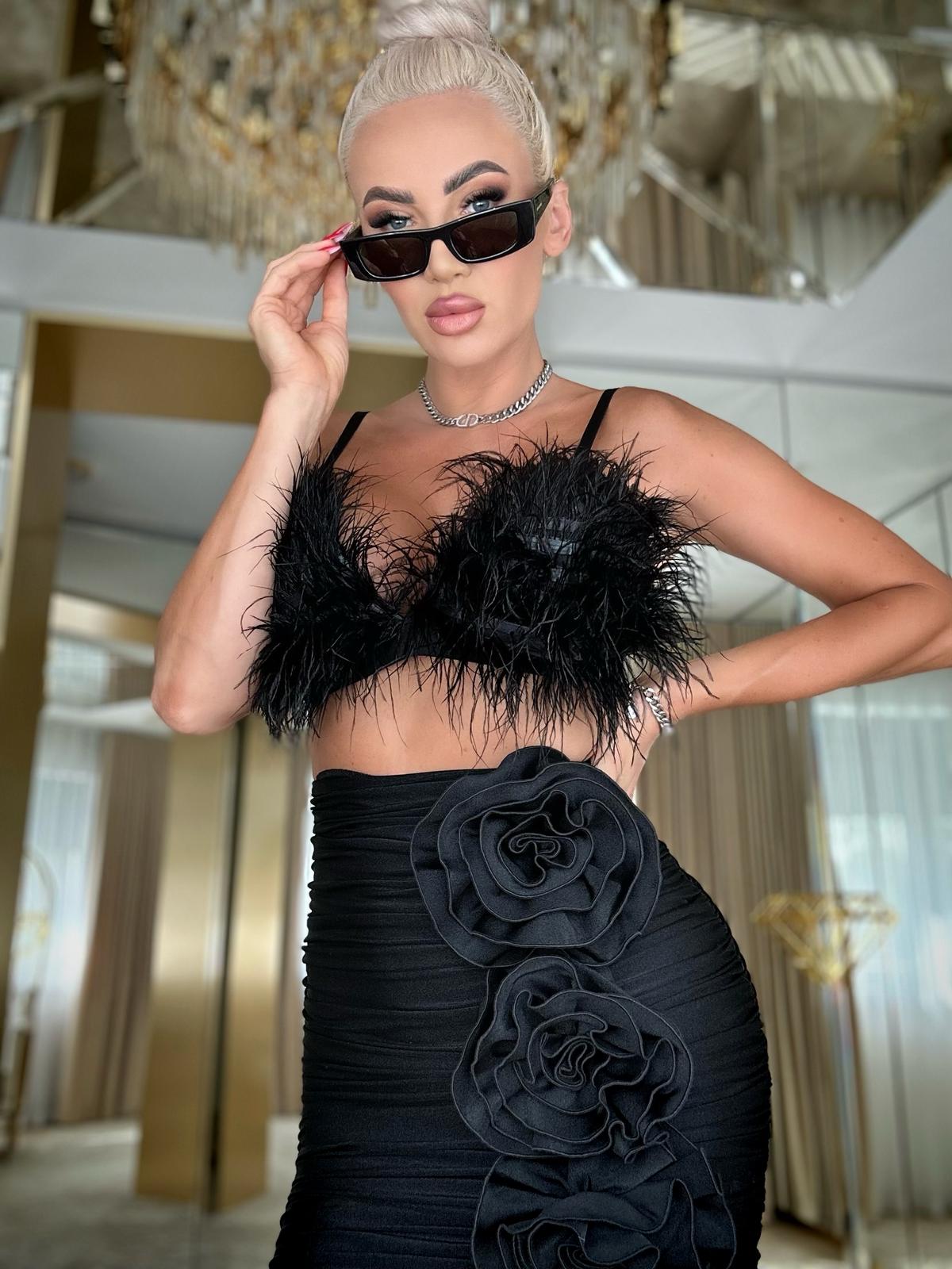 High-waisted ruched skirt crarfted from stretchy black lycra. Fitted silhouette with a center back seam that enhances the shape. Decorated with statement 3D rosette appliqués and finished with concealed back zipper