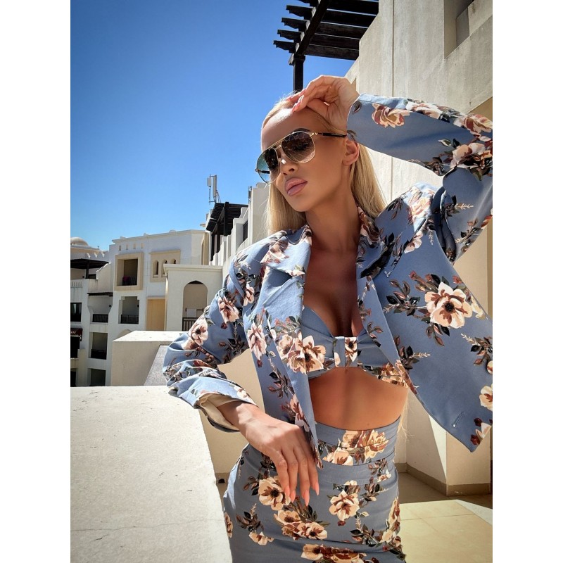 Floral cropped top crafted from soft fabric in a dusty blue shade. Designed with thin straps and a bow-effect neckline that beautifully enhances the décolletage. Finished with beige lining and decorative button closure at the back.