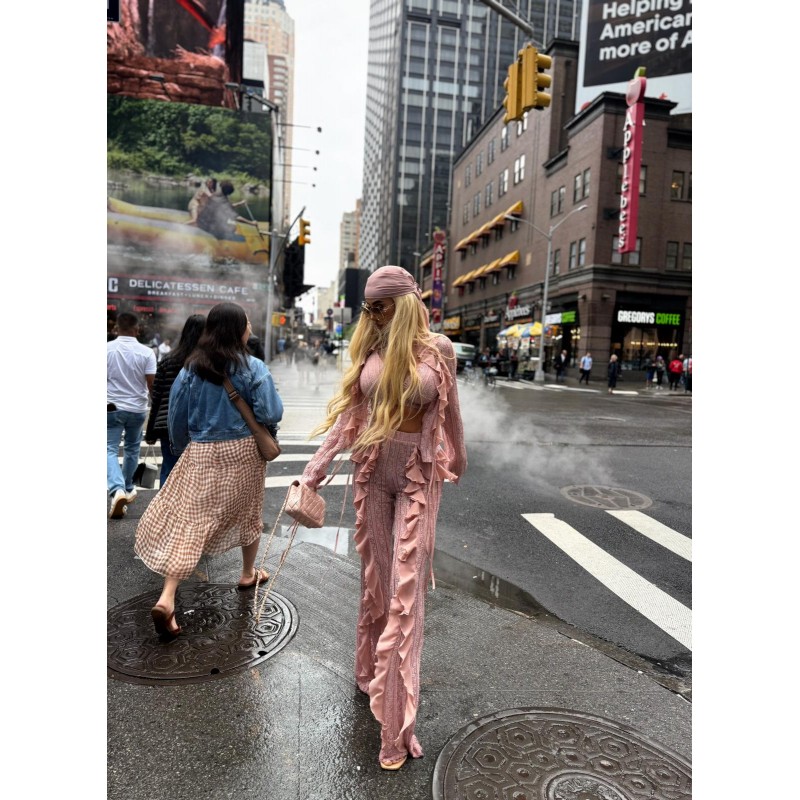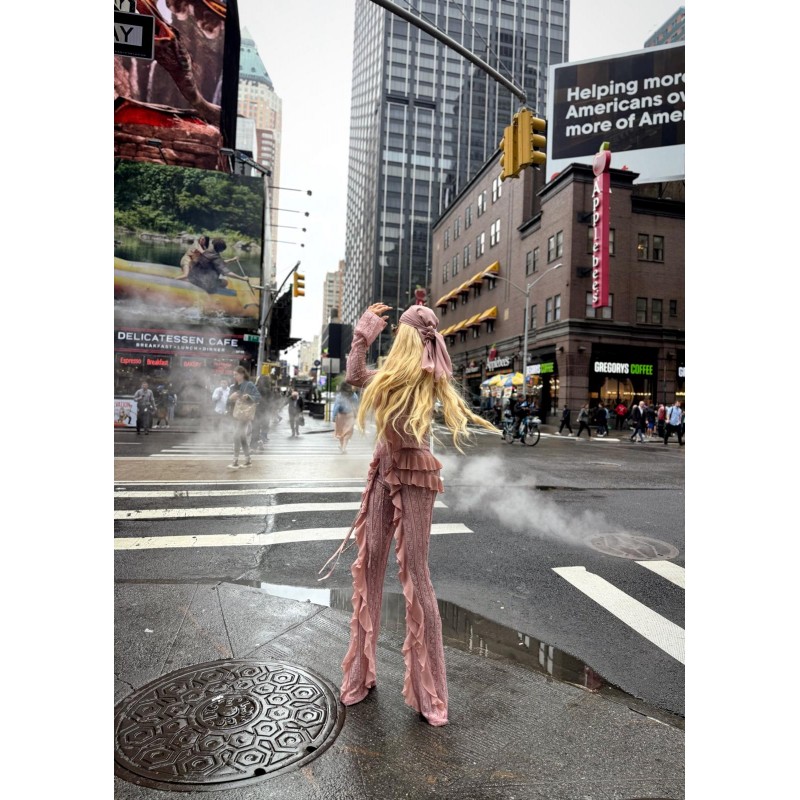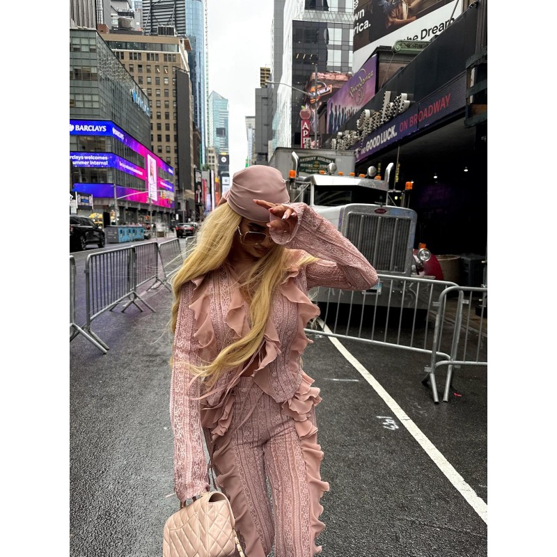 Stretch lace pants in soft heather with chiffon ruffle details. High elastic waist and slightly flared legs.