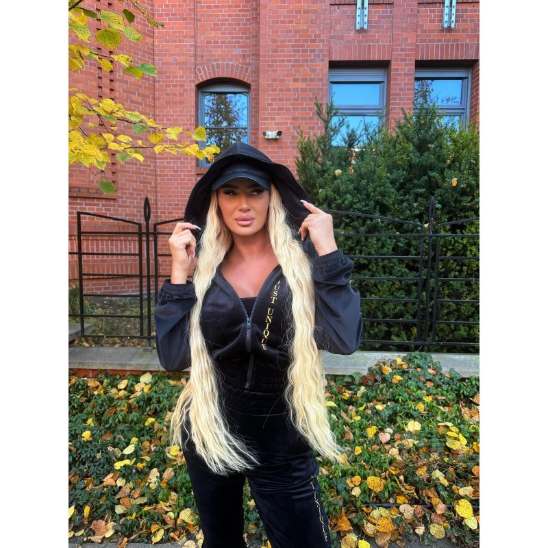 Soft velour two-piece set in classic black, featuring a zip-up hoodie with logo details and relaxed high-waist pants.