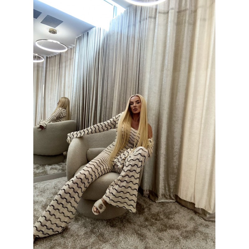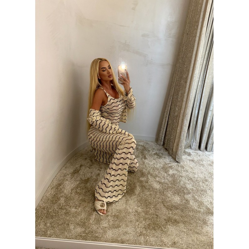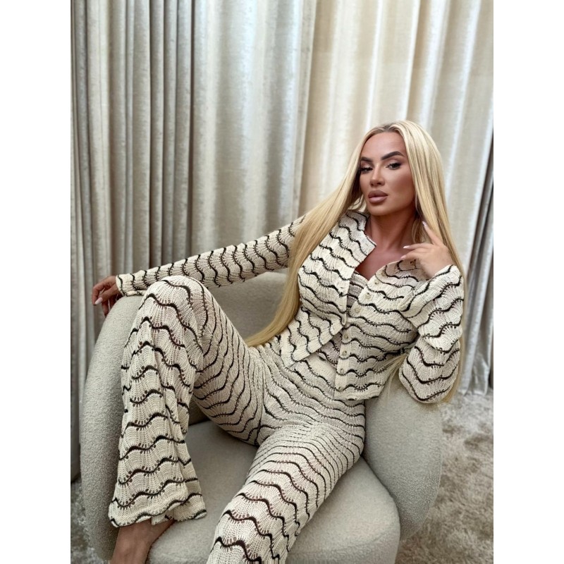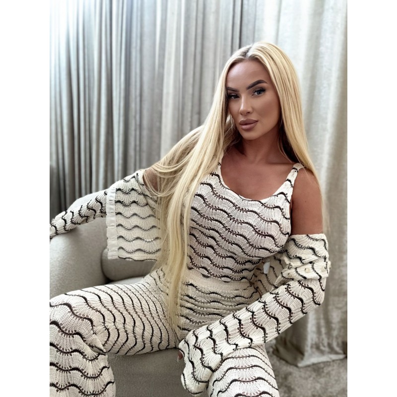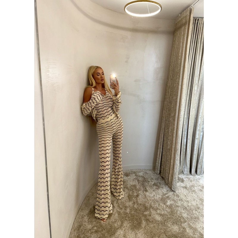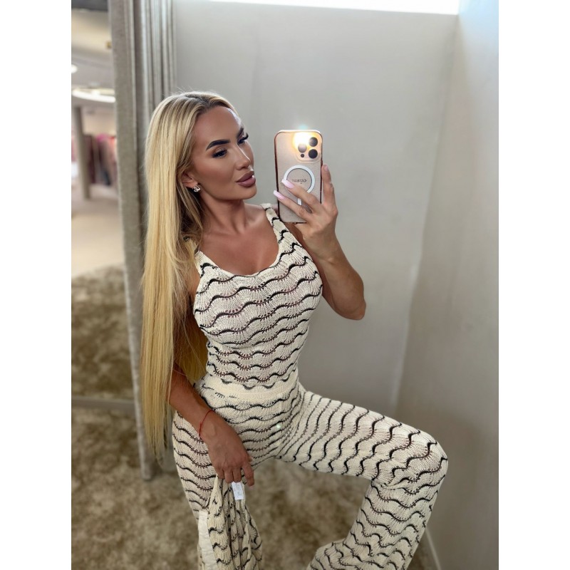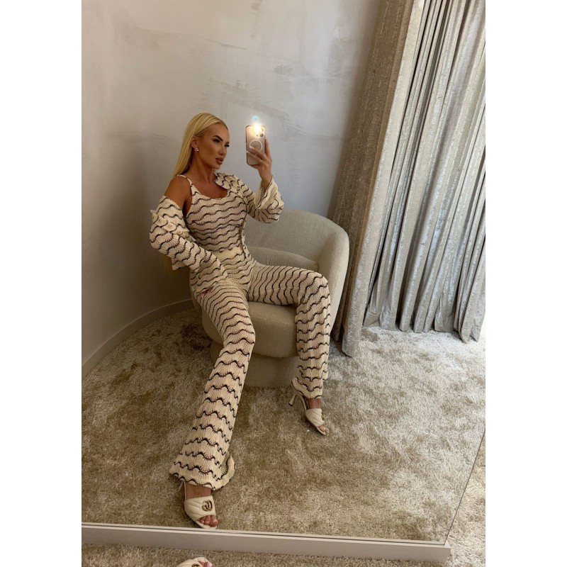 Beige knit two-piece set, Two-piece set made from stretch knit fabric in beige with black pattern and a subtle semi-sheer effect. Sleeveless top with clean neckline. High-waisted pants with an elastic waistband and flared legs.